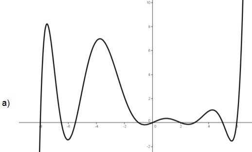 I was given about 7 graphs, so I could determine the minimum degree they could have, if the degree is odd or even, if the greatest coefficient is positive or negative, and if the independent term is positive, negative or zero; but there are 3 that I have doubts about. Could anyone advise?